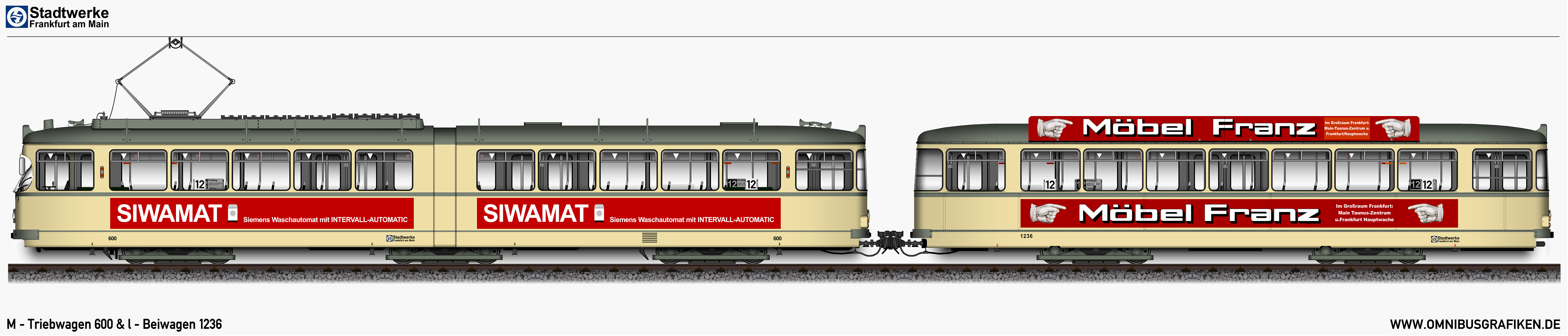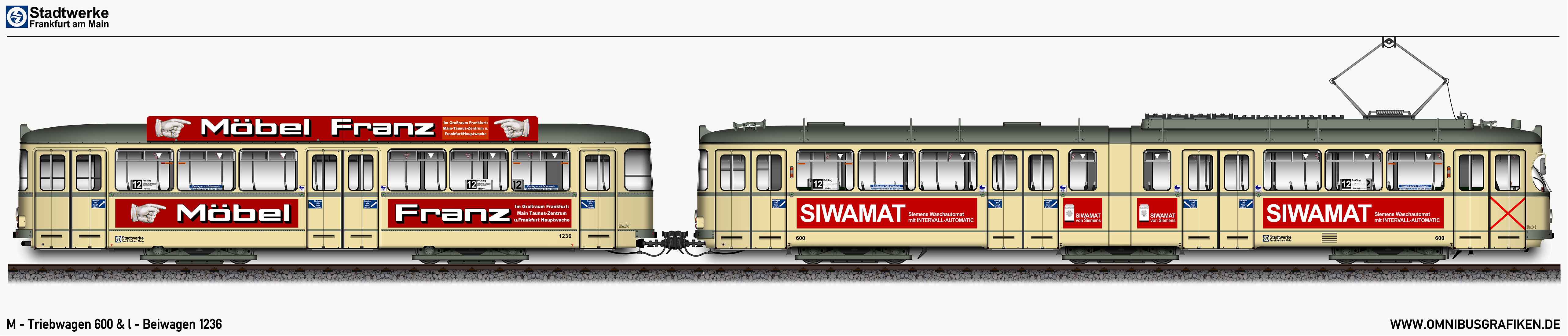 M - Triebwagen 600 und l - Beiwagen 1236, Ansichten von 1975 |